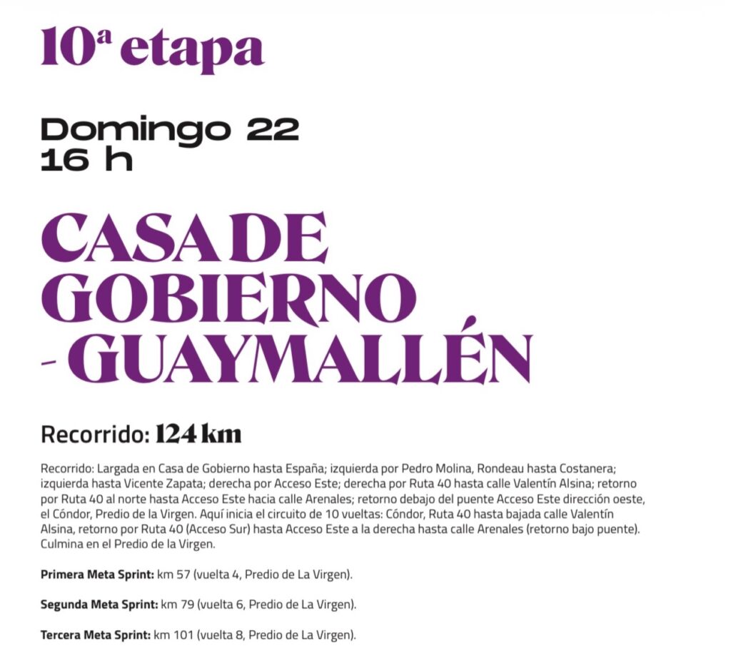 La Vuelta de Mendoza 2026 llegará a su gran definición el domingo 22 de febrero, con la disputa de la 10ª y última etapa, que partirá a las 16 horas desde la Casa de Gobierno. El recorrido final tendrá una extensión de 124 kilómetros, con un circuito urbano exigente que incluirá 10 vueltas y tres metas sprint intermedias.
