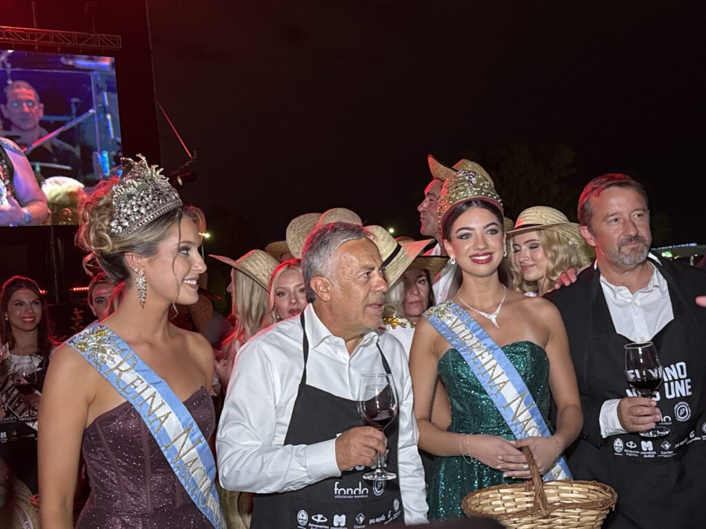 Luego llegó uno de los instantes más simbólicos de la noche: la cosecha tradicional. Entre cuecas, gatos y música cuyana en vivo, las candidatas departamentales cortaron racimos de vid en los viñedos ubicados bajo el escenario, manteniendo viva la esencia agrícola del festejo.