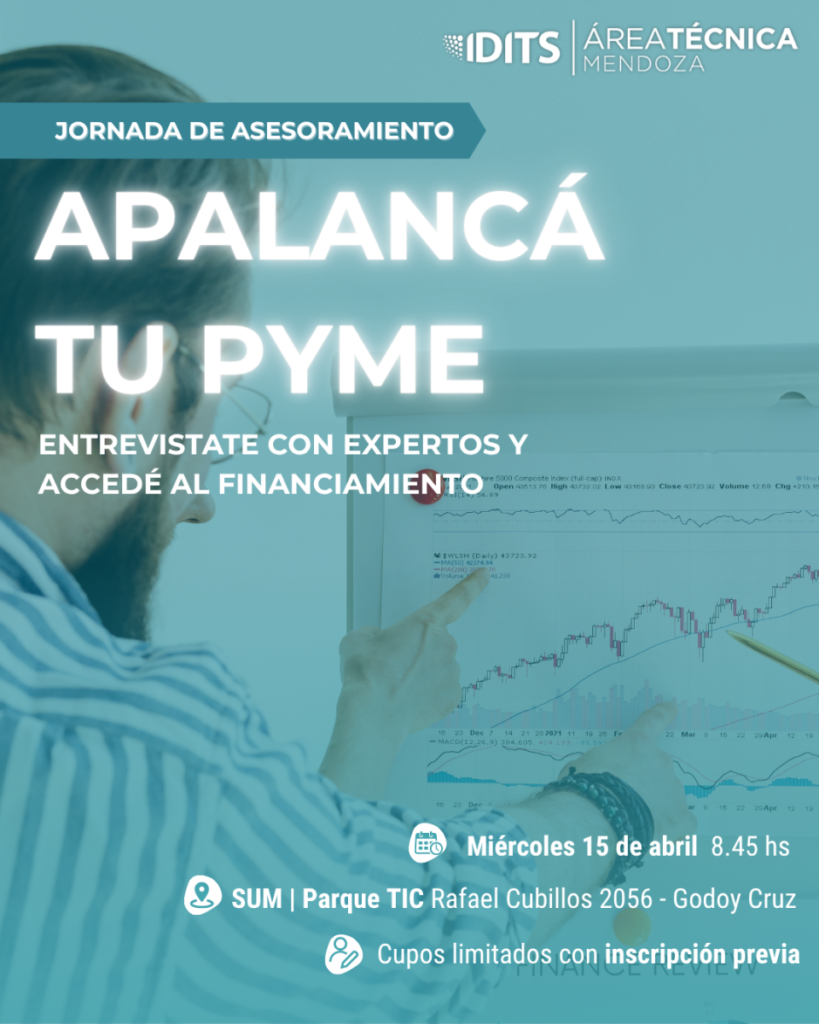 El Instituto de Desarrollo Industrial, Tecnológico y de Servicios (IDITS) lanzó una convocatoria dirigida a pymes de Mendoza para participar en la jornada de asesoramiento “Apalancá tu pyme – Entrevistate con expertos y accedé al financiamiento”, que se realizará el miércoles 15, desde las 8.45, en el SUM del Edificio Central del Parque TIC, ubicado en Rafael Cubillos 2056, Godoy Cruz.