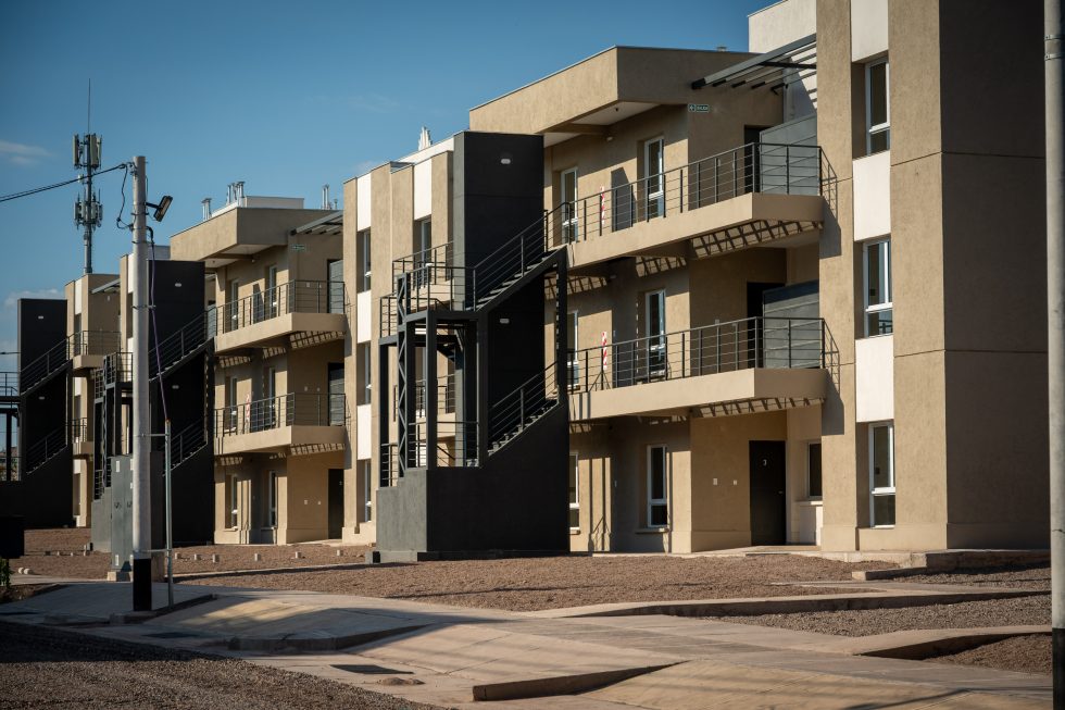 Las viviendas tienen superficies que van de los 64 a los 67 metros cuadrados, cuentan con dos dormitorios, cochera y terminaciones de calidad. Además, el conjunto dispone de infraestructura completa: redes de gas natural, agua potable, cloacas, alumbrado público, rampas de accesibilidad y arbolado urbano.