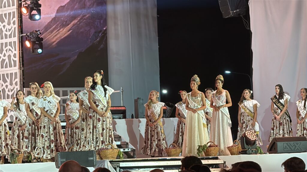 El momento simbólico continuó con las candidatas departamentales, junto a la Reina y la Virreina Nacional, elevando canastos con frutos de cada rincón de la provincia. El gesto recordó que antes del brillo de la corona está el esfuerzo silencioso de la tierra y sus trabajadores.