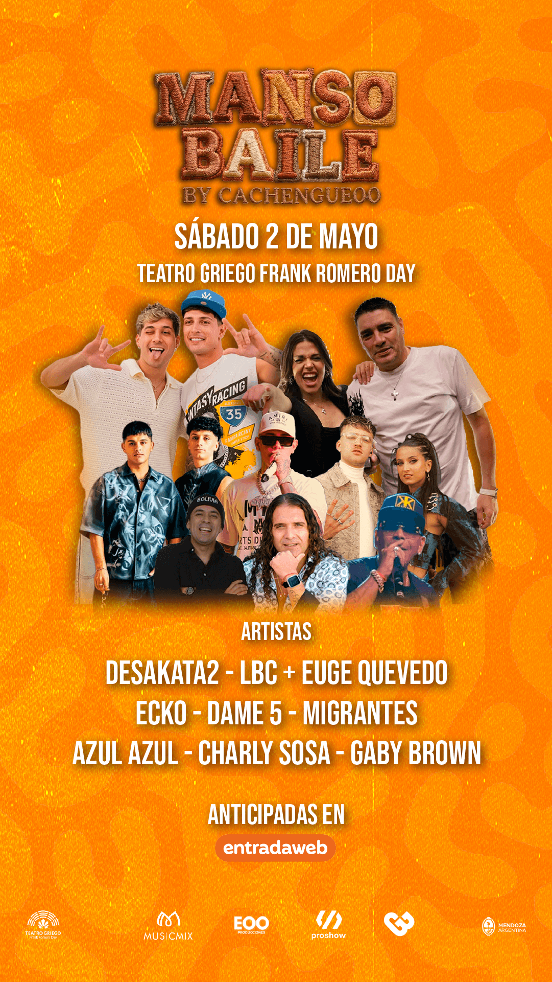 Manso Baile en Mendoza propone una experiencia única con “La noche del Cachengue” en el Teatro Griego, donde se presentarán en vivo Euge Quevedo + LBC, DesaKTa2, Ecko y otros artistas destacados. La propuesta incluye patio gastronómico, barras y se desarrollará el sábado 2 de mayo, de 16 a 2 de la madrugada. Las entradas ya están disponibles a través de www.Passline.com y www.entradaweb.com.ar.