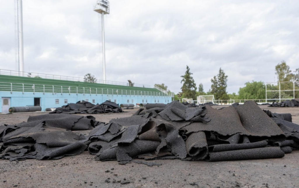 Las primeras intervenciones técnicas en el campo de juego han estado enfocadas en la limpieza del predio y en el retiro y acopio de materiales, que implica el levantamiento del césped y la alfombra sintética existente. Esta tarea se realizó bajo estrictos protocolos de cuidado, garantizando la integridad del material para su posterior reutilización en otros espacios deportivos.Foto Prensa Gobierno de Mendoza.
