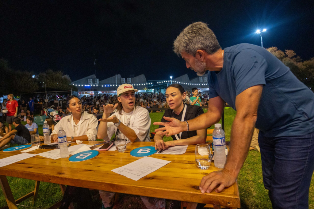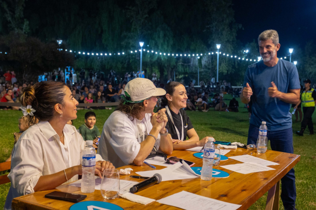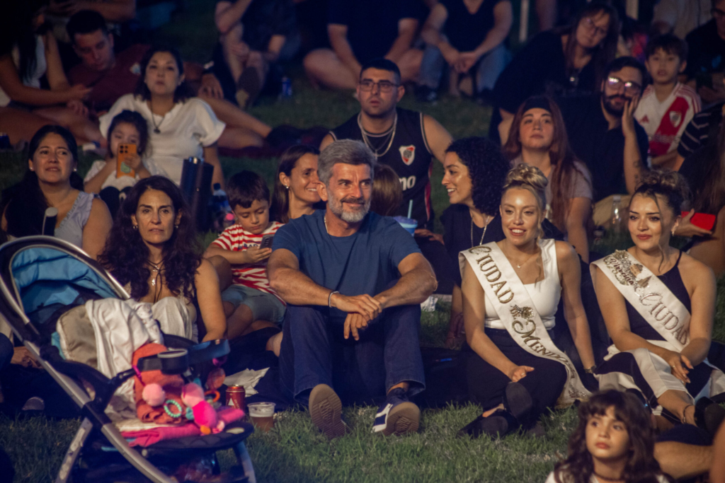 El evento se desarrolló en la Nave Cultural, donde el ambiente se mantuvo festivo y familiar durante ambas noches. Muchas personas asistieron en grupos de amigos, en pareja, con sus familias o incluso con sus mascotas, ya que la propuesta fue pet friendly. El público ocupó el amplio espacio verde del predio: algunos eligieron mesas individuales, otros se ubicaron en mesones compartidos y muchos optaron por sentarse directamente sobre el pasto mientras degustaban hamburguesas y seguían con atención cada instancia del certamen. No faltó tampoco el mate, que varios asistentes llevaron para acompañar la cena en una postal típica mendocina.