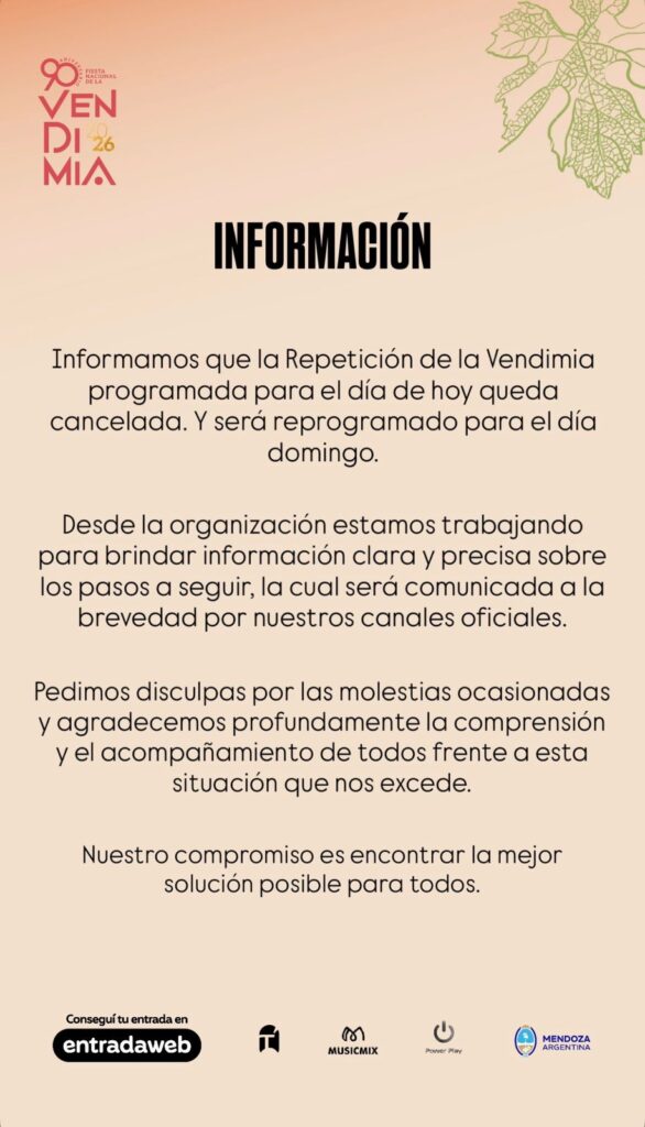 Asimismo, se indicó que la repetición del espectáculo será reprogramada para el día domingo, mientras que en las próximas horas se brindará información más detallada sobre cómo continuará el cronograma y cuáles serán los pasos a seguir.
