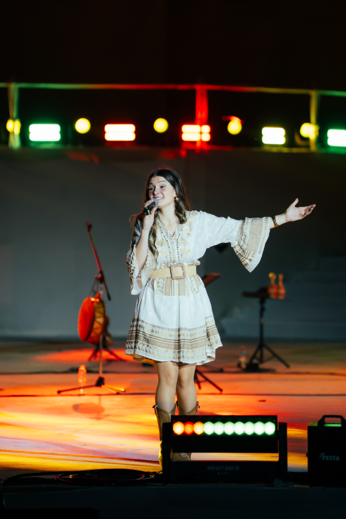 Cuando el atardecer dio paso a la noche en el anfiteatro, llegó el turno de Maggie Cullen. Con su estilo sensible y su potente interpretación, la artista protagonizó uno de los momentos más íntimos del espectáculo, mientras el público acompañó con emoción canciones como “Un poquito de tu amor”, “Milonga de ojos dorados”, “Alfonsina y el Mar” y “La Arenosa”.