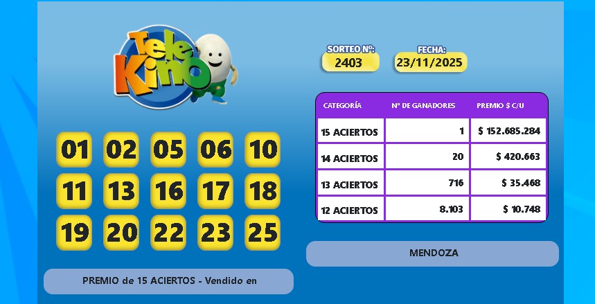 El último sorteo del Telekino volvió a dejar un domingo cargado de alegría en Mendoza. En la jugada Nº 2403, un apostador mendocino logró acertar los 15 números en la modalidad Tradicional y se llevó un premio millonario de $152.685.284.