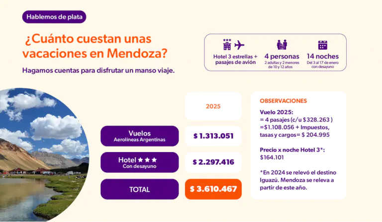 El estudio tomó como referencia una estadía de 14 noches para una familia tipo —dos adultos y dos menores—, contemplando pasajes aéreos y alojamiento en hoteles tres estrellas. Dentro de ese esquema comparativo, Mendoza registró el menor costo total entre los destinos nacionales más elegidos, con un valor estimado de $3.610.467.
