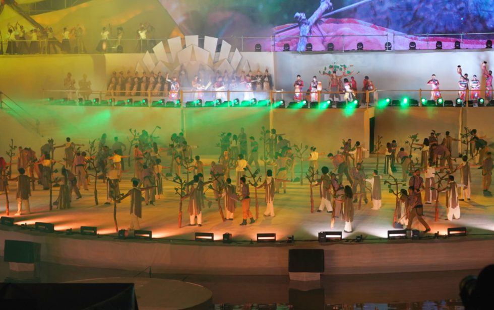 La puesta contó con la participación de 750 artistas en escena entre bailarines, actores y músicos, con música completamente en vivo y un importante despliegue escenográfico. Entre los recursos visuales se destacaron 600 metros cuadrados de cajas lumínicas —patrimonio escenográfico de la Vendimia— y el regreso de los frisos iluminados en el frente del escenario.