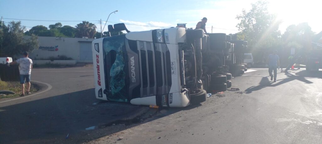 Un camión de carga de origen chileno protagonizó un accidente vial este sabado en Mendoza, al volcar sobre la calzada en la intersección del Acceso Sur y calle Araoz, uno de los puntos neurálgicos del tránsito metropolitano.